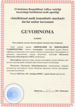 | 6060 | №004032 | Монография - "ИННОВАЦИЯ ВА ИННОВАЦИОН ТАДБИРКОРЛИК" | Махкамова Мамлакат Абдукадировна (100%) | Махкамова Мамлакат Абдукадировна | 12/03/2021 | ![]() |