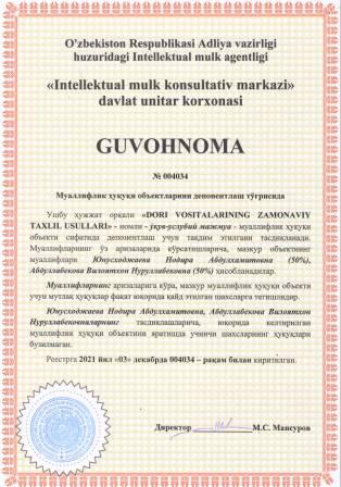 | 6058 | №004034 | Ўқув-услубий мажмуа - "DORI VOSITALARINING ZAMONAVIY TAXLIL USULLARI" | Юнусходжаева Нодира Абдулхамитовна (50%), Абдуллабекова Вилоятхон Нуруллабековна (50%) | Юнусходжаева Нодира Абдулхамитовна, Абдуллабекова Вилоятхон Нуруллабековна | 12/03/2021 | ![]() |