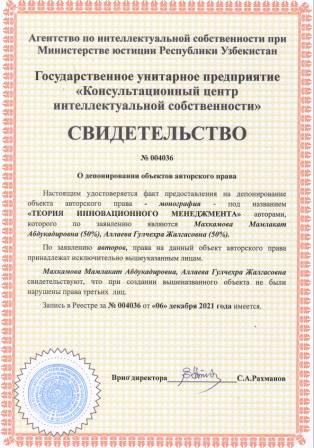 | 6056 | №004036 | Монография - "ТЕОРИЯ ИННОВАЦИОННОГО МЕНЕДЖМЕНТА" | Махкамова Мамлакат Абдукадировна (50%), Аллаева Гулчехра Жалгасовна (50%) | Махкамова Мамлакат Абдукадировна, Аллаева Гулчехра Жалгасовна | 12/06/2021 | ![]() |
