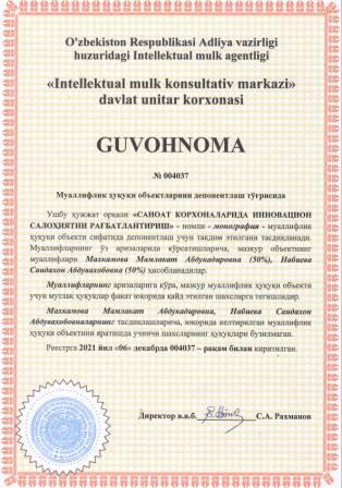 | 6055 | №004037 | Монография - "САНОАТ КОРХОНАЛАРИДА ИННОВАЦИОН САЛОҲИЯТНИ РАҒБАТЛАНТИРИШ" | Махкамова Мамлакат Абдукадировна (50%), Набиева Саидахон Абдувахобовна (50%) | Махкамова Мамлакат Абдукадировна, Набиева Саидахон Абдувахобовна | 12/06/2021 | ![]() |