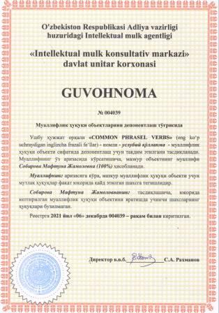 | 6053 | №004039 | Услубий қўлланма - "COMMON PHRASEL VERBS" (eng ko‘p uchraydigan inglizcha frazali fe‘llar) | Собирова Мафтуна Жамоловна (100%) | Собирова Мафтуна Жамоловна | 12/06/2021 | ![]() |