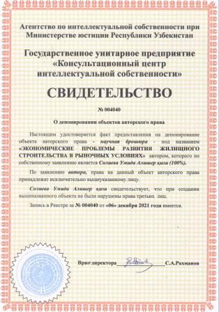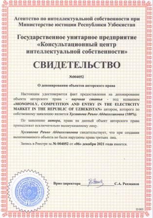 | 6042 | №004052 | Научная статья – "MONOPOLY, COMPETITION AND ENTRY IN THE ELECTRCITY MARKET IN THE REPUBLIC OF UZBEKISTAN" | Хусаинова Раъно Абдихоликовна (100%) | Хусаинова Раъно Абдихоликовна | 12/06/2021 | ![]() |