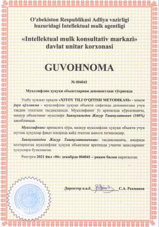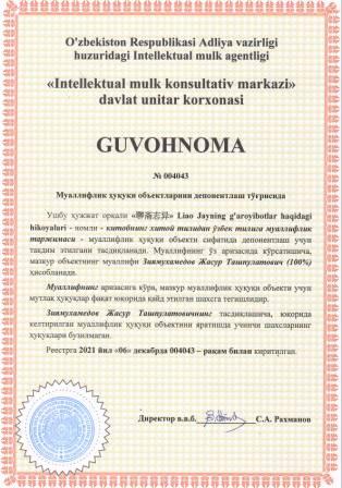 | 6049 | №004043 | Китобнинг хитой тилидан ўзбек тилига муаллифлик таржимаси - "聊斋志异" Liao Jayning g'aroyibotlar haqidagi hikoyalari | Зиямухамедов Жасур Ташпулатович (100%) | Зиямухамедов Жасур Ташпулатович | 12/06/2021 | ![]() |