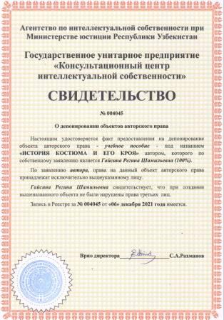 | 6047 | №004045 | Учебное пособие - "ИСТОРИЯ КОСТЮМА И ЕГО КРОЯ" | Гайсина Регина Шамильевна (100%) | Гайсина Регина Шамильевна | 12/06/2021 | ![]() |