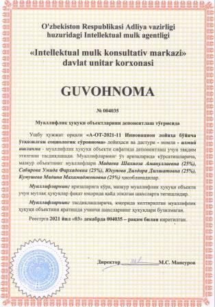 | 6057 | №004035 | Илмий ишланма - "А-ОТ-2021-11 Инновацион лойиҳа бўйича ўтказилган социологик сўровнома" лойиҳаси ва дастури | Мадаева Шахноза Амануллаевна (25%), Сабирова Умида Фархадовна (25%), Юсупова Дилдора Дилшатовна (25%), Кумушева Мадина Махамаджоновна (25%) | Мадаева Шахноза Амануллаевна, Сабирова Умида Фархадовна, Юсупова Дилдора Дилшатовна, Кумушева Мадина Махамаджоновна | 12/03/2021 | ![]() |