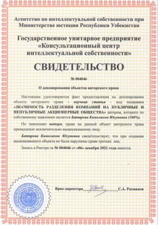 | 6046 | №004046 | Научная статья – "ЗНАЧИМОСТЬ РАЗДЕЛЕНИЯ КОМПАНИЙ НА ПУБЛИЧНЫЕ И НЕПУБЛИЧНЫЕ АКЦИОНЕРНЫЕ ОБЩЕСТВА" | Батирова Камолахон Юсуповна (100%) | Батирова Камолахон Юсуповна | 12/06/2021 | ![]() |