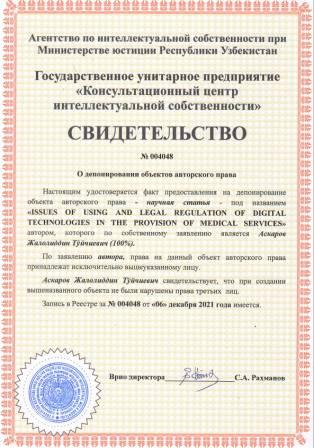 | 6045 | №004048 | Научная статья – "ISSUES OF USING AND LEGAL REGULATION OF DIGITAL TECHNOLOGIES IN THE PROVISION OF MEDICAL SERVICES" | Аскаров Жалолиддин Тўйчиевич (100%) | Аскаров Жалолиддин Тўйчиевич | 12/06/2021 | ![]() |