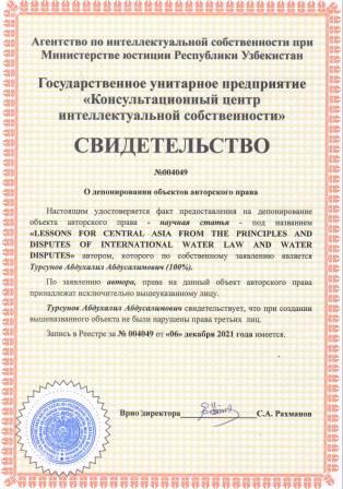 | 6044 | №004049 | Научная статья – "LESSONS FOR CENTRAL ASIA FROM THE PRINCIPLES AND DISPUTES OF INTERNATIONAL WATER LAW AND WATER DISPUTES" | Турсунов Абдухалил Абдусалимович (100%) | Турсунов Абдухалил Абдусалимович | 12/06/2021 | ![]() |