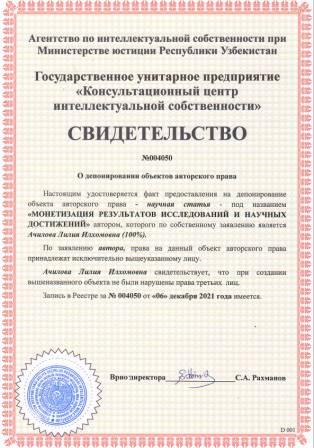 | 6043 | №004050 | Научная статья – "МОНЕТИЗАЦИЯ РЕЗУЛЬТАТОВ ИССЛЕДОВАНИЙ И НАУЧНЫХ ДОСТИЖЕНИЙ" | Ачилова Лилия Илхомовна (100%) | Ачилова Лилия Илхомовна | 12/06/2021 | ![]() |