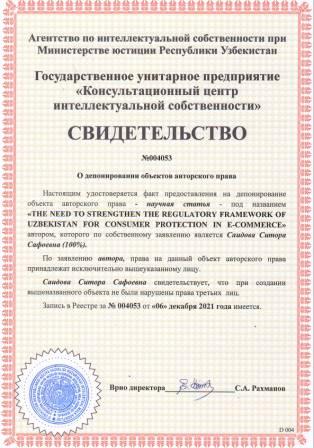 | 6041 | №004053 | Научная статья – "THE NEED TO STRENGTHEN THE REGULATORY FRAMEWORK OF UZBEKISTAN FOR CONSUMER PROTECTION IN E-COMMERCE" | Саидова Ситора Сафоевна (100%) | Саидова Ситора Сафоевна | 12/06/2021 | ![]() |