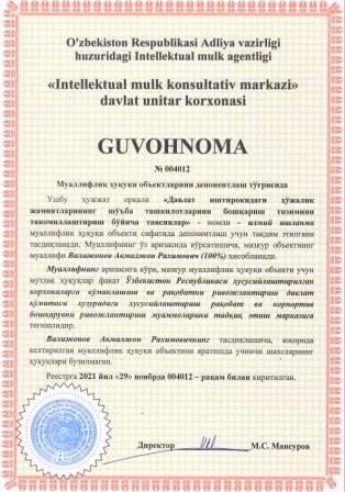 | 6080 | №004012 | Илмий ишланма - "Давлат иштирокидаги ҳўжалик жамиятларининг шўъба ташкилотларини бошқариш тизимини такомиллаштириш бўйича тавсиялар" | Валижонов Акмалжон Рахимович (100%) | Ўзбекистон Республикаси хусусийлаштирилган корхоналарга кўмаклашиш ва рақобатни ривожлантириш давлат қўмитаси хузуридаги хусусийлаштириш рақобат ва корпоратив бошқарувни ривожлантириш муаммоларини тадқиқ этиш маркази | 11/29/2021 | ![]() |