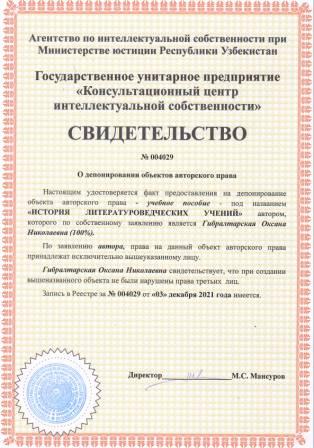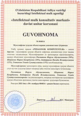 | 6078 | №004014 | Дарслик - "PEDAGOGIK KOMPETENTLIK" | Рахматова Феруза Абулқосимовна (50%), Шеранова Марям Базарбаевна (20%), Байтўраева Насиба Исматуллаевна (15%), Уктамова Умида Сунатуллаевна (15%) | Рахматова Феруза Абулқосимовна, Шеранова Марям Базарбаевна, Байтўраева Насиба Исматуллаевна, Уктамова Умида Сунатуллаевна | 11/30/2021 | ![]() |
