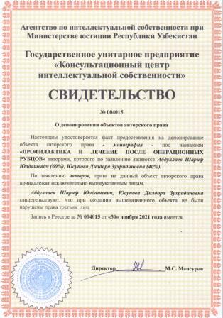 | 6077 | №004015 | Монография - "ПРОФИЛАКТИКА И ЛЕЧЕНИЕ ПОСЛЕ ОПЕРАЦИОННЫХ РУБЦОВ" | Абдуллаев Шариф Юлдашевич (60%), Юсупова Дилдора Зухридиновна (40%) | Абдуллаев Шариф Юлдашевич, Юсупова Дилдора Зухридиновна | 11/30/2021 | ![]() |