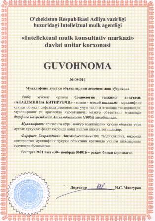 | 6076 | №004016 | Илмий ишланма - Социологик тадқиқот анкетаси: "АКАДЕМИЯ ВА БИТИРУВЧИ" | Фарфиев Бахрамджан Атхамджанович (100%) | Фарфиев Бахрамджан Атхамджанович | 11/30/2021 | ![]() |