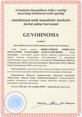 | 6075 | №004017 | Монография - "ИНВЕСТИЦИОН ЛОЙИҲАЛАР РИСКЛАРИНИ БАҲОЛАШНИ МОДЕЛЛАШТИРИШ" | Насретдинова Шахноза Саидакмаловна (60%), Джалилов Достонбек Абдуазизович (20%), Мирзаев Бобур Сойибжонович (20%) | Насретдинова Шахноза Саидакмаловна, Джалилов Достонбек Абдуазизович, Мирзаев Бобур Сойибжонович | 11/30/2021 | ![]() |