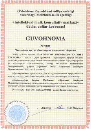| 6074 | №004018 | Ўқув қўлланма - "ДАКТИЛЬ ВА ИМО-ИШОРА НУТҚИГА ЎРГАТИШ" | Мамаражабова Зулфия Нарбоевна (50%), Абдуллаева Мафтуна Мухитдиновна (50%) | Мамаражабова Зулфия Нарбоевна, Абдуллаева Мафтуна Мухитдиновна | 11/30/2021 | ![]() |