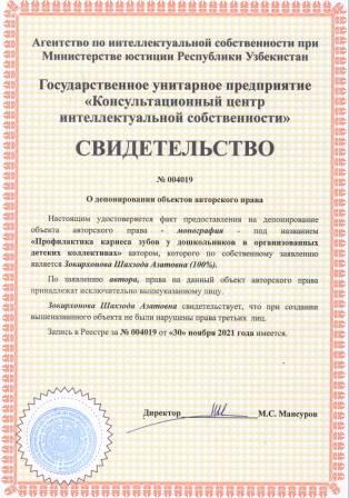 | 6073 | №004019 | Монография - "Профилактика кариеса зубов у дошкольников в организованных детских коллективах" | Зокирхонова Шахзода Азатовна (100%) | Зокирхонова Шахзода Азатовна | 11/30/2021 | ![]() |