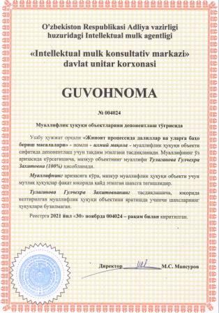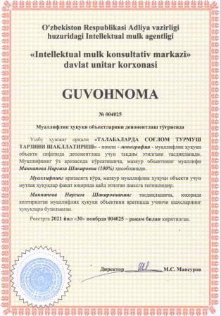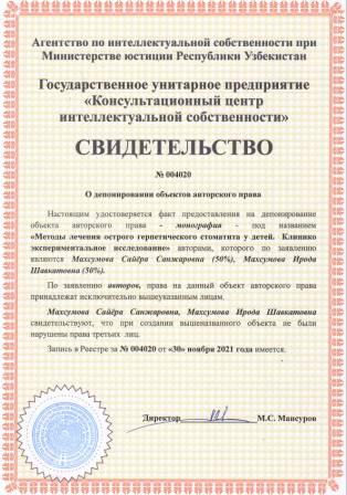 | 6072 | №004020 | Монография - "Методы лечения острого герпетического стоматита у детей. Клинико экспериментальное исследование" | Махсумова Сайёра Санжаровна (50%), Махсумова Ирода Шавкатовна (50%) | Махсумова Сайёра Санжаровна, Махсумова Ирода Шавкатовна | 11/30/2021 | ![]() |