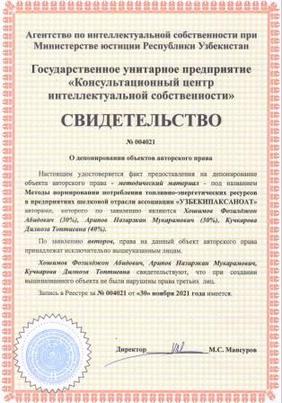 | 6071 | №004021 | Методический материал - Методы нормирования потребления топливно-энергетических ресурсов в предприятиях шелковой отрасли ассоциации "УЗБЕКИПАКСАНОАТ" | Хошимов Фозилджон Абидович (30%), Арипов Назиржан Мукарамович (30%), Кучкарова Дилноза Топтиевна (40%) | Хошимов Фозилджон Абидович, Арипов Назиржан Мукарамович, Кучкарова Дилноза Топтиевна | 11/30/2021 | ![]() |