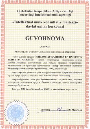 | 6069 | №004023 | Монография - "ҚИШЛОҚ ҲЎЖАЛИГИДА ЕР НАЗОРАТИ: ҚОНУН ВА АМАЛИЁТ" | Мирзаабдуллаева Матлуба Рустамовна (100%) | Мирзаабдуллаева Матлуба Рустамовна | 11/30/2021 | ![]() |