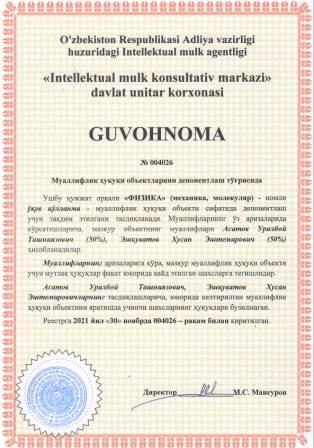 | 6066 | №004026 | Ўқув қўлланма - "ФИЗИКА" (механика, молекуляр) | Асатов Уралбой Ташниязович (50%), Эшқуватов Хусан Эштемирович (50%) | Асатов Уралбой Ташниязович, Эшқуватов Хусан Эштемирович | 11/30/2021 | ![]() |