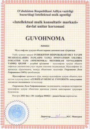 | 6070 | №004022 | Услубий қўлланма - O‘ZBEKISTON RESPUBLIKASI OLIY TA‘LIM MUASSASALARIDA FANLARNI YANGI INNOVATSION USLUBDA O‘RGATISH YANI "MNEMONIKA" METODIKASI YO‘NALISHINI TADBIQ QILISH | Умурзакова Лола Ғайратовна (100%) | "EUROPEAN MEDICAL UNIVERSITY" маъсулияти чекланган жамияти | 11/30/2021 | ![]() |