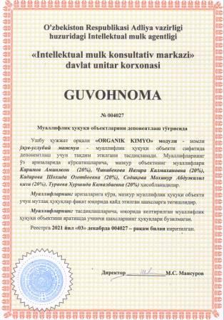 | 6065 | №004027 | Ўқув-услубий мажмуа - "ORGANIK KIMYO" модули | Каримов Аминжон (20%), Чинибекова Назира Калмахановна (20%), Кадирова Шохида Озотбоевна (20%), Содиқова Мохинур Абдужалил қизи (20%), Тураева Хуршида Камалбаевна (20%) | Каримов Аминжон, Чинибекова Назира Калмахановна, Кадирова Шохида Озотбоевна, Содиқова Мохинур Абдужалил қизи, Тураева Хуршида Камалбаевна | 12/03/2021 | ![]() |