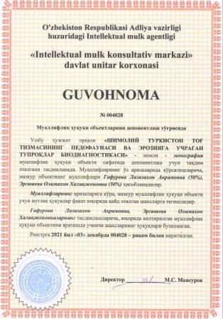 | 6064 | №004028 | Монография - "ШИМОЛИЙ ТУРКИСТОН ТОҒ ТИЗМАСИНИНГ ПЕДОФАУНАСИ ВА ЭРОЗИЯГА УЧРАГАН ТУПРОҚЛАР БИОДИАГНОСТИКАСИ" | Гафурова Лазизахон Акрамовна (50%), Эргашева Олимахон Халиқжоновна (50%) | Гафурова Лазизахон Акрамовна, Эргашева Олимахон Халиқжоновна | 12/03/2021 | ![]() |