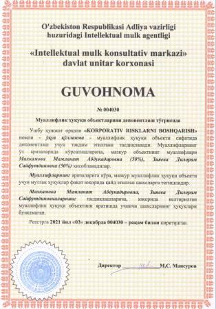 | 6062 | №004030 | Ўқув қўлланма - "KORPORATIV RISKLARNI BOSHQARISH" | Махкамова Мамлакат Абдукадировна (50%), Зияева Дилорам Сайфутдиновна (50%) | Махкамова Мамлакат Абдукадировна, Зияева Дилорам Сайфутдиновна | 12/03/2021 | ![]() |