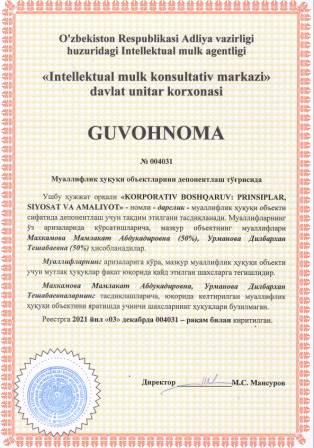 | 6061 | №004031 | Дарслик - "KORPORATIV BOSHQARUV: PRINSIPLAR, SIYOSAT VA AMALIYOT" | Махкамова Мамлакат Абдукадировна (50%), Урманова Дилбархан Тешабаевна (50%) | Махкамова Мамлакат Абдукадировна (50%), Урманова Дилбархан Тешабаевна (50%) | 12/03/2021 | ![]() |
