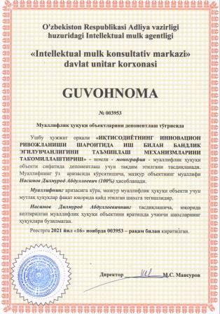 | 6139 | №003953 | ИҚТИСОДИЁТНИНГ ИННОВАЦИОН РИВОЖЛАНИШИ ШАРОИТИДА ИШ БИЛАН БАНДЛИК ЭГИЛУВЧАНЛИГИНИ ТАЪМИНЛАШ МЕХАНИЗМЛАРИНИ ТАКОМИЛЛАШТИРИШ" | Насимов Дилмурод Абдуллоевич (100%) | Насимов Дилмурод Абдуллоевич | 11/16/2021 | ![]() |