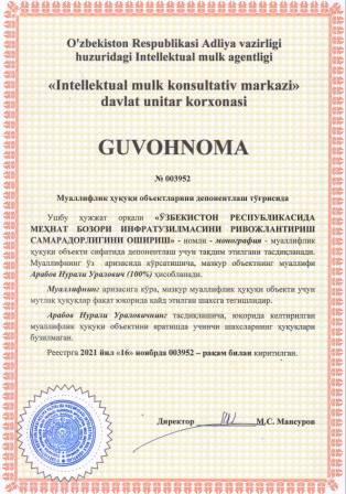 | 6140 | №003952 | Монография - "ЎЗБЕКИСТОН РЕСПУБЛИКАСИДА МЕҲНАТ БОЗОРИ ИНФРАТУЗИЛМАСИНИ РИВОЖЛАНТИРИШ САМАРАДОРЛИГИНИ ОШИРИШ" | Арабов Нурали Уралович (100%) | Арабов Нурали Уралович | 11/16/2021 | ![]() |