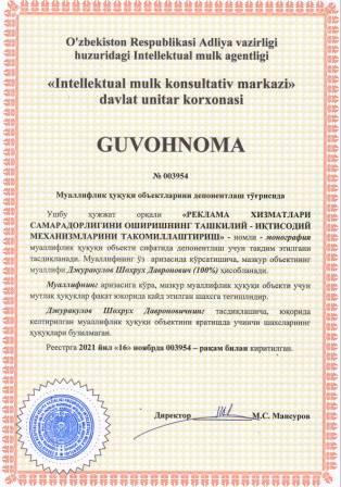 | 6138 | №003954 | Монография - "РЕКЛАМА ХИЗМАТЛАРИ САМАРАДОРЛИГИНИ ОШИРИШНИНГ ТАШКИЛИЙ - ИҚТИСОДИЙ МЕХАНИЗМЛАРИНИ ТАКОМИЛЛАШТИРИШ" | Джуракулов Шохрух Давронович (100%) | Джуракулов Шохрух Давронович | 11/16/2021 | ![]() |