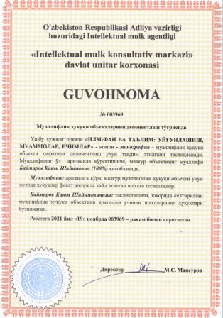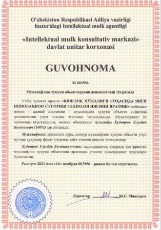 | 6136 | №003956 | Илмий ишланма - "ҚИШЛОҚ ҲЎЖАЛИГИ СОҲАСИДА ЯНГИ ИННОВАЦИОН СУҒОРИШ ТЕХНОЛОГИЯСИНИ ЯРАТИШ" лойиҳаси | Худояров Улугбек Болтаевич (100%) | Худояров Улугбек Болтаевич | 11/16/2021 | ![]() |