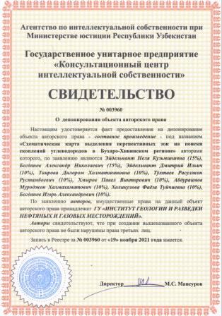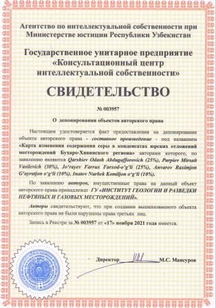 | 6135 | №003957 | Составное произведение - "Англо-узбКарта изменения содержания серы в конденсатах юрских отложений месторождений Бухаро-Хивинского региона" | Qarshiev Odash Abdugafforovich (25%), Parpiev Mirsait Vasilevich (30%), Jo‘rayev Farrux Farxod-o‘g‘li (25%), Anvarov Raximjon G‘ayratjon o‘g‘li (10%), Inatov Nurbek Komiljon o‘g‘li (10%) | ГУ "ИНСТИТУТ ГЕОЛОГИИ И РАЗВЕДКИ НЕФТЯНЫХ И ГАЗОВЫХ МЕСТОРОЖДЕНИЙ" | 11/17/2021 | ![]() |
