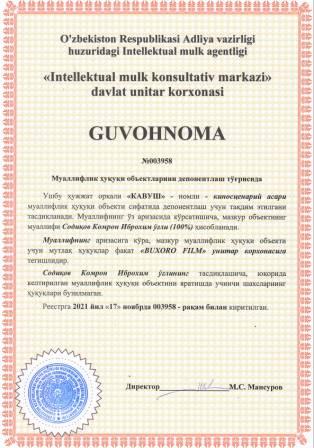 | 6134 | №003958 | Киносценарий асари - "КАВУШ" | Содиқов Комрон Иброхим ўғли (100%) | "BUXORO FILM" унитар корхонаси | 11/17/2021 | ![]() |