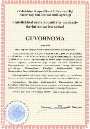 | 6133 | №003959 | Архитектура ва дизайн асари - "МУҲАММАД РАСУЛУЛЛОҲ СОЛЛАЛЛОҲУ АЛАЙҲИ ВАСАЛЛАМ ЖОМЕЪ МАСЖИДИ БИНОСИНИНГ ТАКЛИФ ЛОЙИҲАСИ" | Muxamedjanov Kabuldjan Xodjimuratovich (50%), Muxamedjanov Burxon Kabuldjanovich (50%) | Muxamedjanov Kabuldjan Xodjimuratovich, Muxamedjanov Burxon Kabuldjanovich | 11/19/2021 | ![]() |