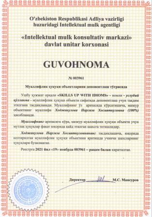 | 6131 | №003961 | Услубий қўлланма - "SKILLS UP WITH IDIOMS" | Ходжакулова Наргиза Хосияткуловна (100%) | Ходжакулова Наргиза Хосияткуловна | 11/19/2021 | ![]() |