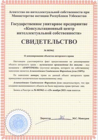 | 6130 | №003962 | Музыкальное произведение без текста - "EMPTINESS" (пустота) | Агзамходжаев Саидазизхон Фарходхон ўғли (100%) | Агзамходжаев Саидазизхон Фарходхон ўғли | 11/19/2021 | ![]() |