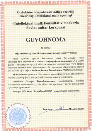 | 6129 | №003963 | Инфографика анимацион 2 D видео ролик - "Менинг кун тартибим" | Атабаева Дамира Турдибековна (100%) | Атабаева Дамира Турдибековна | 11/19/2021 | ![]() |