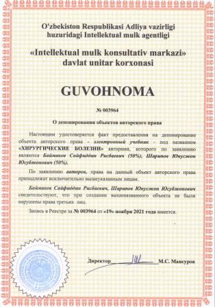 | 6128 | №003964 | Электронный учебник - "ХИРУРГИЧЕСКИЕ БОЛЕЗНИ" | Баймаков Сайфиддин Рисбаевич (50%), Шарипов Юнусжон Юсубжонович (50%) | Баймаков Сайфиддин Рисбаевич, Шарипов Юнусжон Юсубжонович | 11/19/2021 | ![]() |