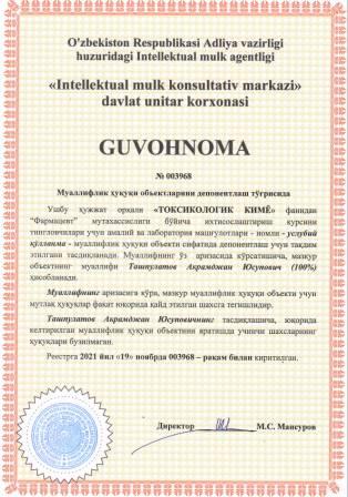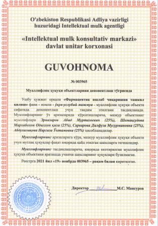 | 6127 | №003965 | Ўқув-услубий мажмуа - "Фармацевтик ишлаб чиқаришни ташкил қилиш" фани | Эрназаров Абид Муртазоевич (25%), Шомақсудова Мархабохон Одилхон қизи (25%), Сарварова Дилфуза Мусурмановна (25%), Абдухалиқова Наргиза Ўктамовна (25%) | Эрназаров Абид Муртазоевич, Шомақсудова Мархабохон Одилхон қизи, Сарварова Дилфуза Мусурмановна, Абдухалиқова Наргиза Ўктамовна | 11/19/2021 | ![]() |