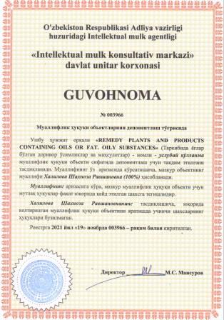 | 6126 | №003966 | Услубий қўлланма - "REMEDY PLANTS AND PRODUCTS CONTAINING OILS OR FAT. OILY SUBSTANCES" (Таркибида ёғлар бўлган доривор ўсимликлар ва маҳсулотлар) | Халилова Шахноза Равшановна (100%) | Халилова Шахноза Равшановна | 11/19/2021 | ![]() |