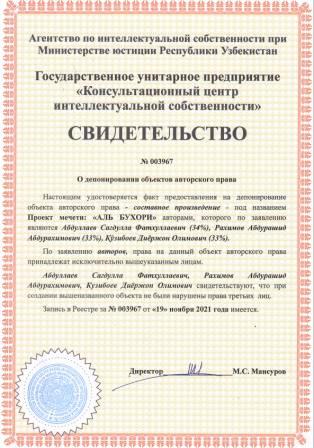| 6125 | №003967 | Составное произведение - Проект мечети: "АЛЬ БУХОРИ" | Абдуллаев Сагдулла Фатхуллаевич (34%), Рахимов Абдурашид Абдурахимович (33%), Қўзибоев Диёржон Олимович (33%) | Абдуллаев Сагдулла Фатхуллаевич, Рахимов Абдурашид Абдурахимович, Қўзибоев Диёржон Олимович | 11/19/2021 | ![]() |
