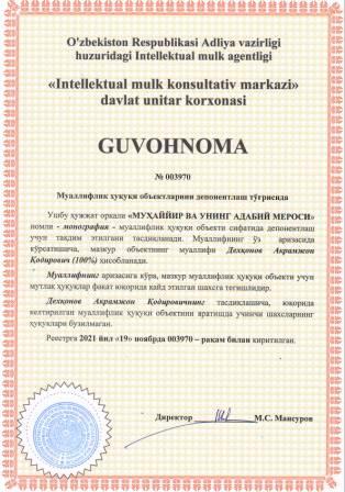 | 6122 | №003970 | Монография - "МУҲАЙЙИР ВА УНИНГ АДАБИЙ МЕРОСИ" | Дехқонов Акрамжон Қодирович (100%) | Дехқонов Акрамжон Қодирович | 11/19/2021 | ![]() |
