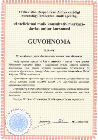 | 6121 | №003971 | Кўп қисмли сериалнинг сценарий асари - "СЎНГИ ЯПРОҚ" | Matyakubova Go‘zal Saliyevna (100%) | "MEDIA SHOW TV" маъсулияти чекланган жамияти | 11/22/2021 | ![]() |