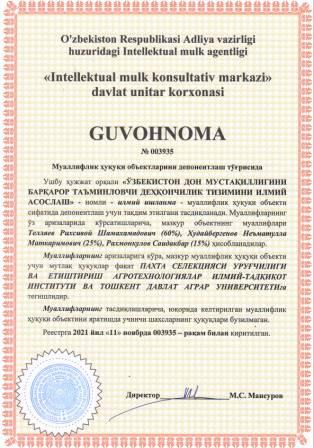| 6157 | №003935 | Илмий ишланма - "ЎЗБЕКИСТОН ДОН МУСТАҚИЛЛИГИНИ БАРҚАРОР ТАЪМИНЛОВЧИ ДЕҲҚОНЧИЛИК ТИЗИМИНИ ИЛМИЙ АСОСЛАШ" | Телляев Рихсивой Шамахамадович (60%), Худайбергенов Неъматулла Маткаримович (25%), Рахмонкулов Саидакбар (15%) | Телляев Рихсивой Шамахамадович, Худайбергенов Неъматулла Маткаримович, Рахмонкулов Саидакбар | 11/11/2021 | ![]() |