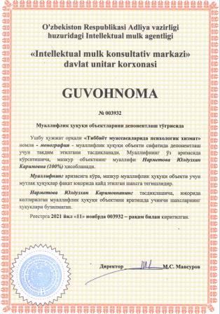 | 6160 | №003932 | Монография - "Тиббиёт муассасаларида психологик хизмат" | Нарметова Юлдузхан Каримовна (100%) | Нарметова Юлдузхан Каримовна | 11/11/2021 | ![]() |