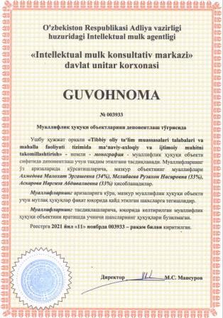 | 6159 | №003933 | Монография - "Tibbiy oliy ta‘lim muassasalari talabalari va mahalla faoliyati tizimida ma‘naviy-axloqiy va ijtimoiy muhitni takomillashtirish" | Ахмедова Малохат Эргашевна (34%), Мелибаева Рузахон Насировна (33%), Аскарова Наргиза Абдивалиевна (33%) | Ахмедова Малохат Эргашевна, Мелибаева Рузахон Насировна, Аскарова Наргиза Абдивалиевна | 11/11/2021 | ![]() |
