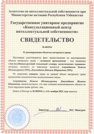 | 6158 | №003934 | Составное произведение - "Англо-узбекско-русский тольковый словарь логистических терминов" | Алаутдинова Камола Шомансуровна (50%), Джумабаева Жамила Шариповна (50%) | Алаутдинова Камола Шомансуровна, Джумабаева Жамила Шариповна | 11/11/2021 | ![]() |